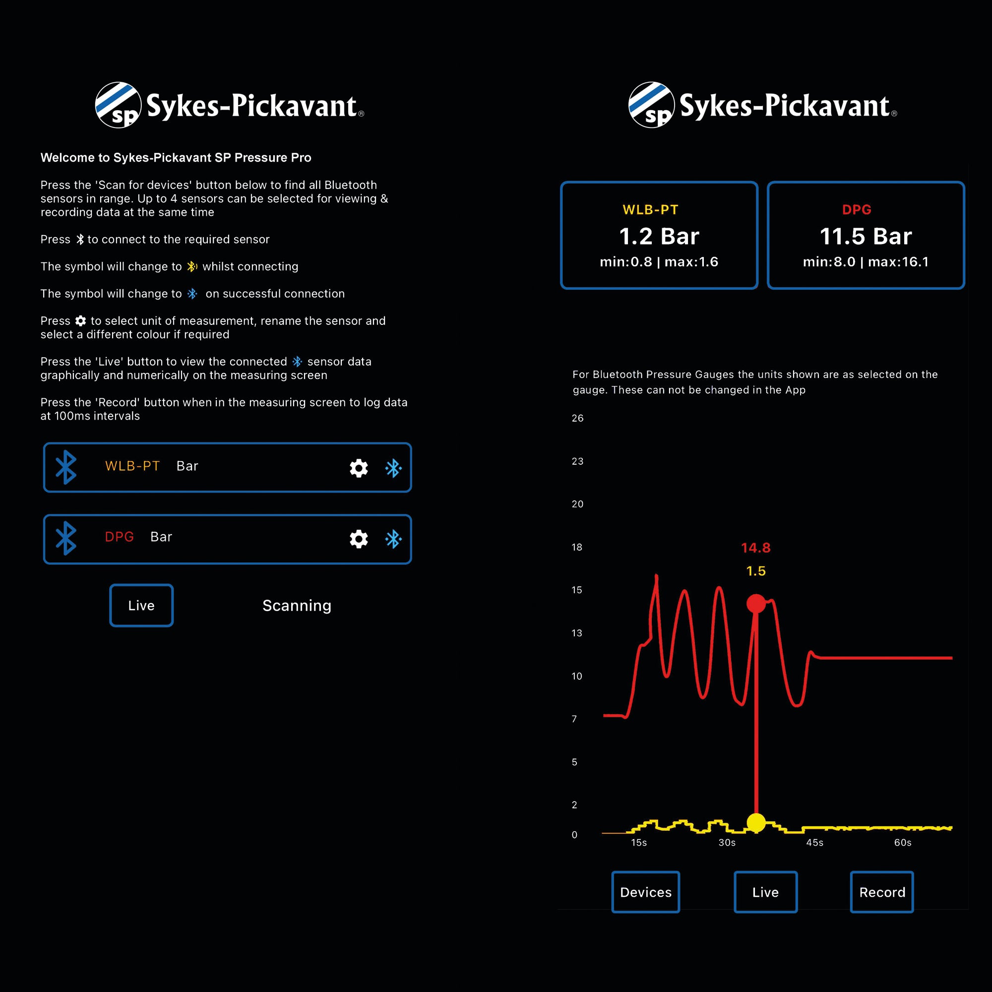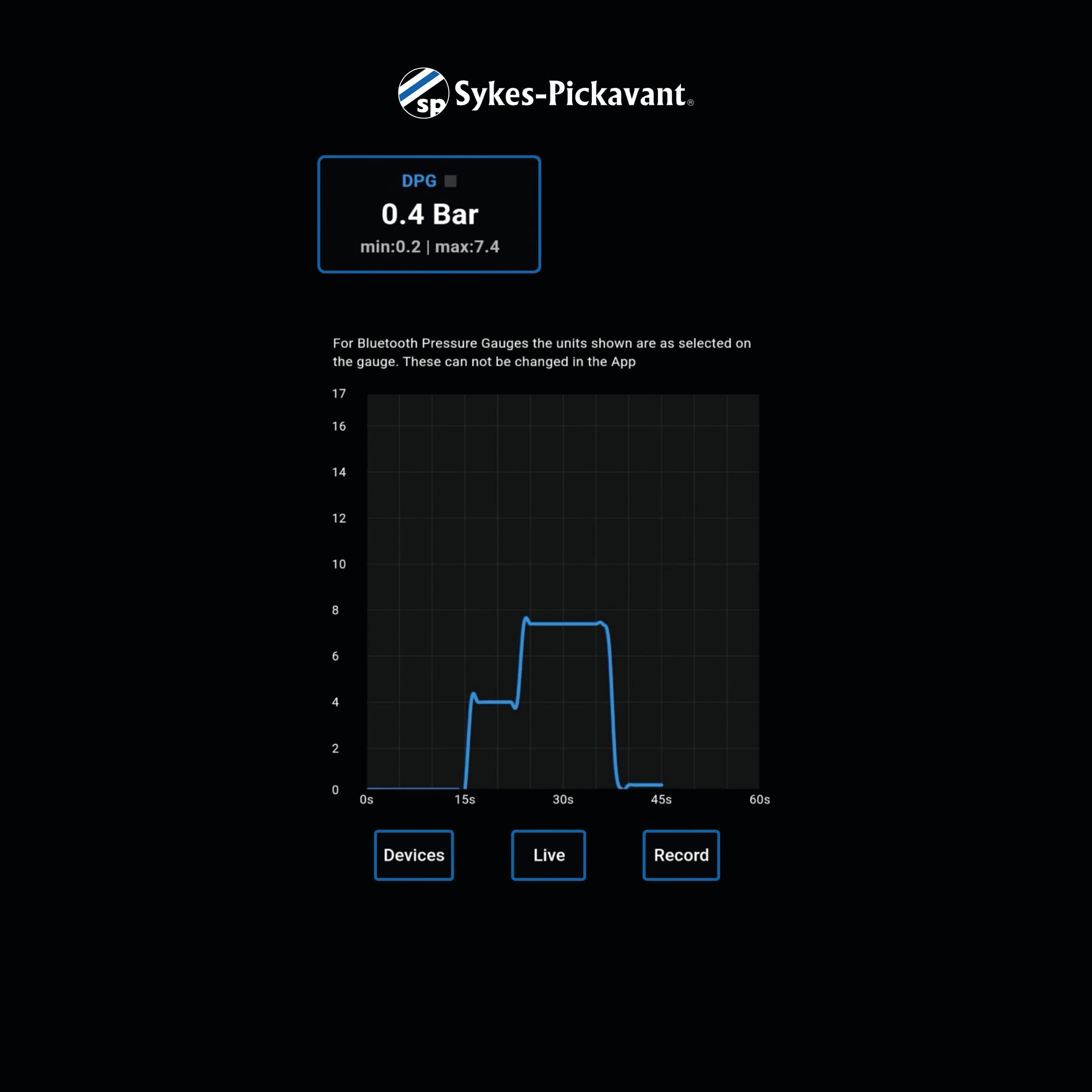 The Sykes Pickavant Bluetooth digital pressure gauge incorporates a high precision pressure sensor with an accurate LCD display showing measured pressure in real time and can transmit readings up to 100 metres via Bluetooth.  Comes complete with hose with quick release fitting to seamlessly use where a 31420100 gauge has previously been used.