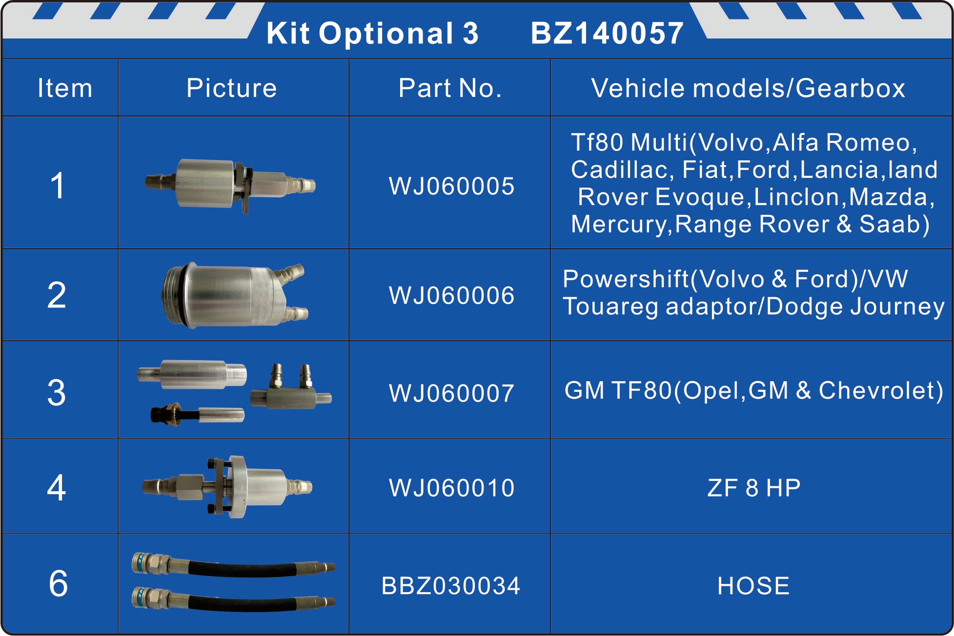 Optional Adaptor Kit Contents:   PART NO CAR MODELS / GEARBOX  WJ060005 Tf80 Multi (Volvo, Alfa Romeo, Cadillac, Fiat, Ford,... Read more